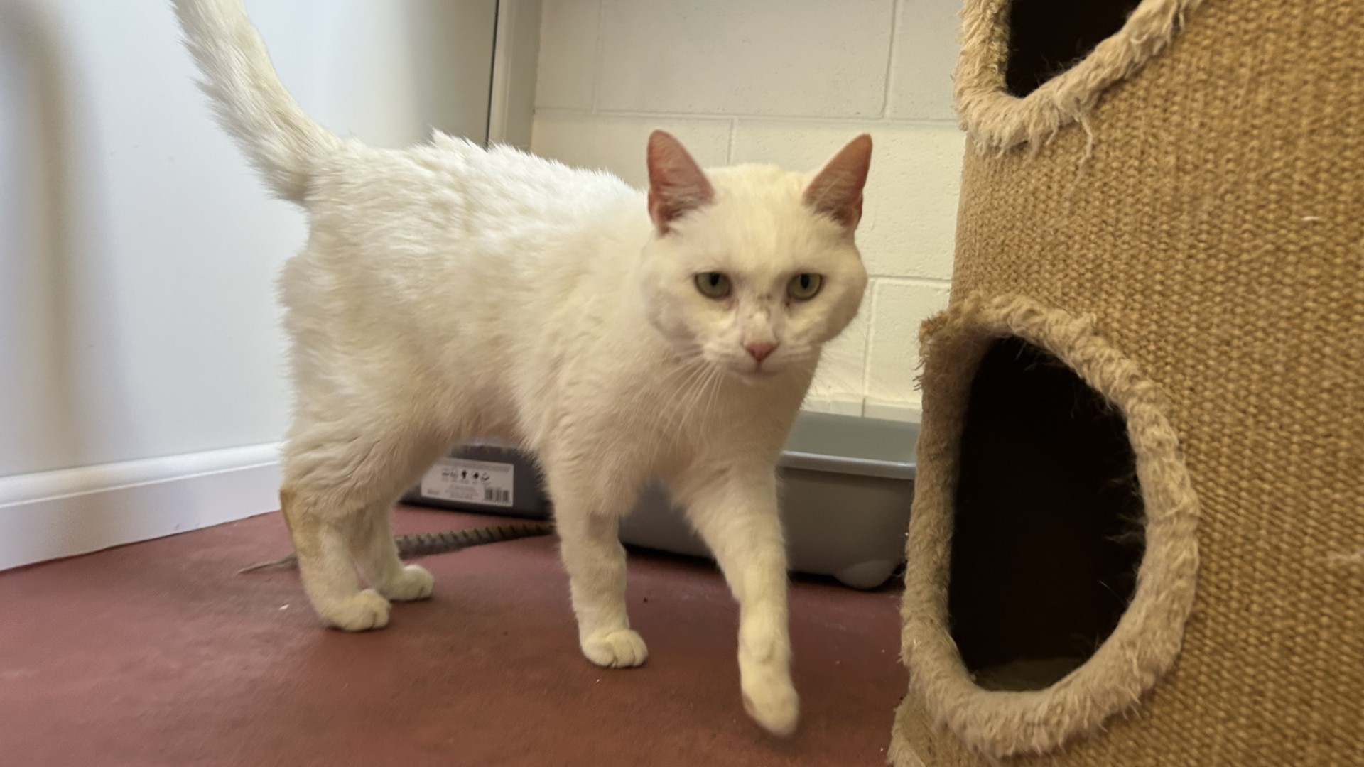 About me: Mr Tambourine Man was a well-loved family cat whose previous owners unfortunately could no longer afford to keep him. He is a friendly and affectionate boy who enjoys curling up in his scratching post hidey-hole for a snooze – but if he hears his pen door open he always emerges for a fuss and a cuddle. He’s a very rare type of puss in that he enjoys going to the vet – on his recent trip for his first vaccination he started giving the vet jabbing him some affectionate head bumps and kisses.